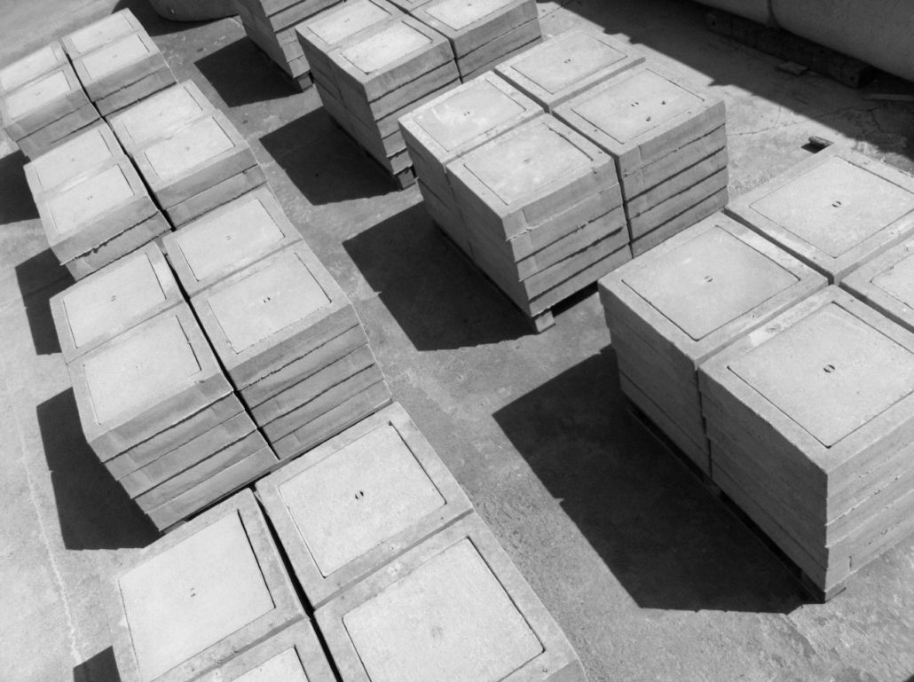 Coperchi in calcestruzzo vibrocompresso a chiusura di pozzetti a sezione quadrata, costituiti da telaio e relativo sigillo di ispezione.