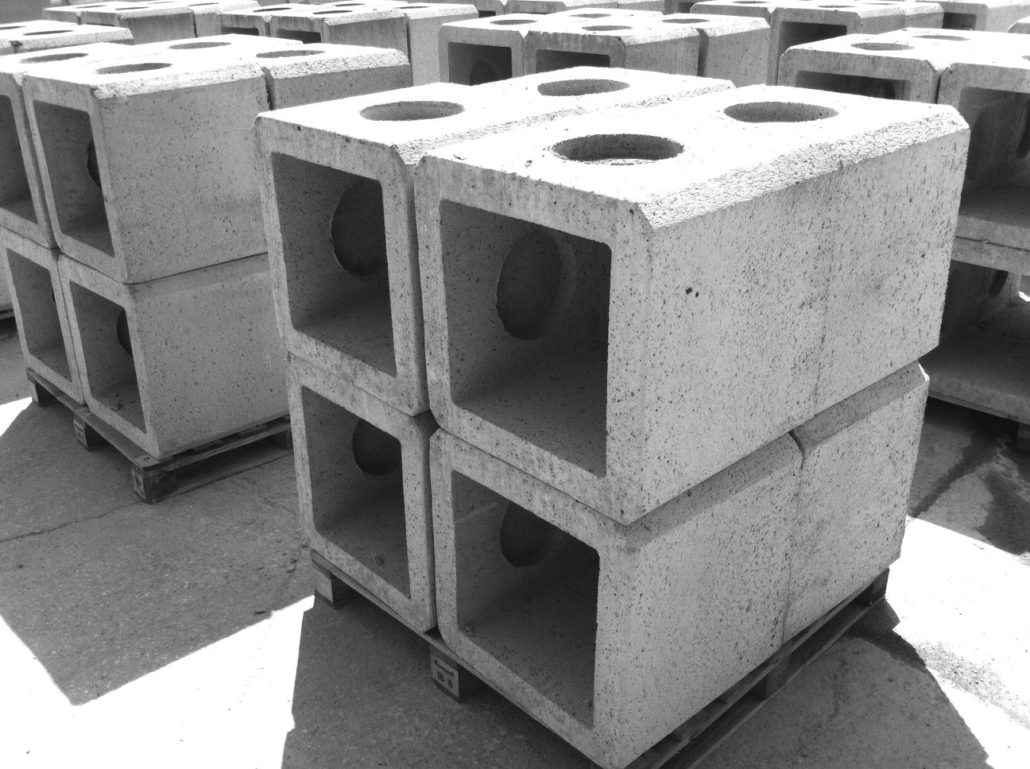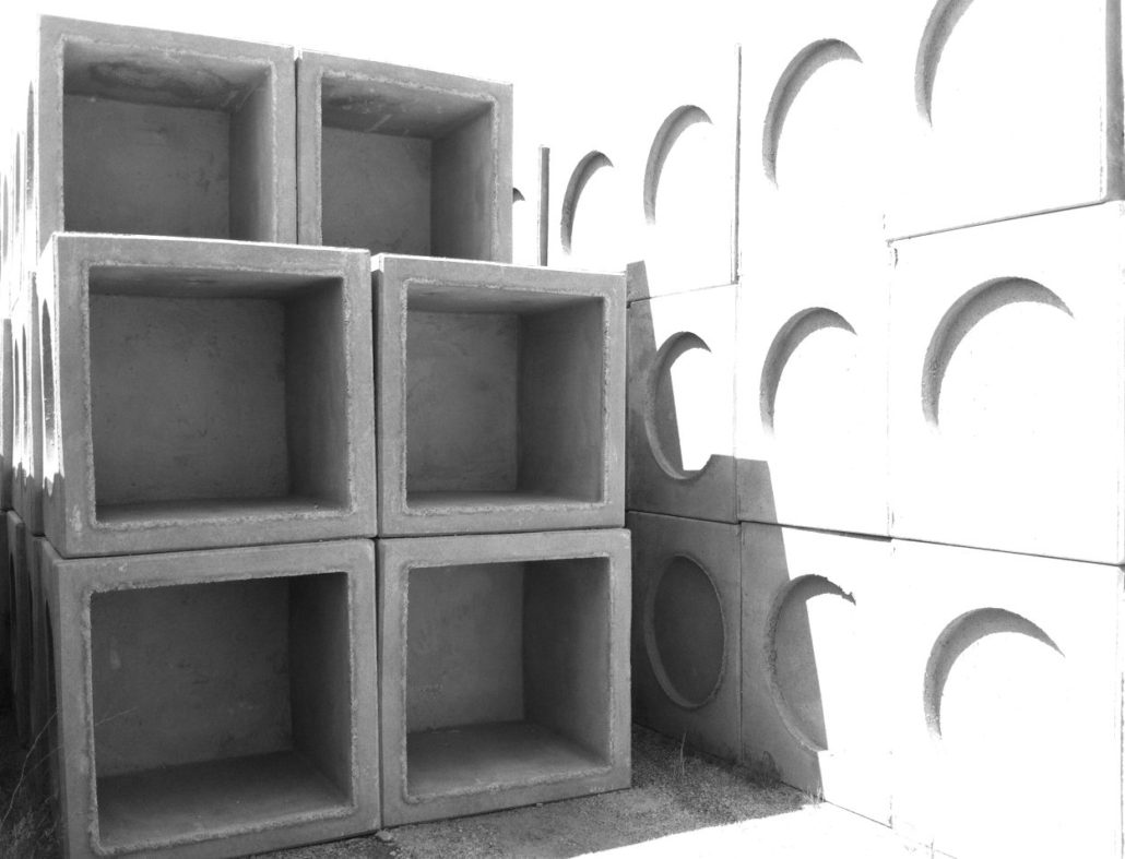 Pozzetti d’ispezione prefabbricati in calcestruzzo vibrocompresso, del tipo rinforzato, a sezione quadrata con alle pareti impronte a “mezzo spessore”, per permettere l’’allacciamento dei tubi.